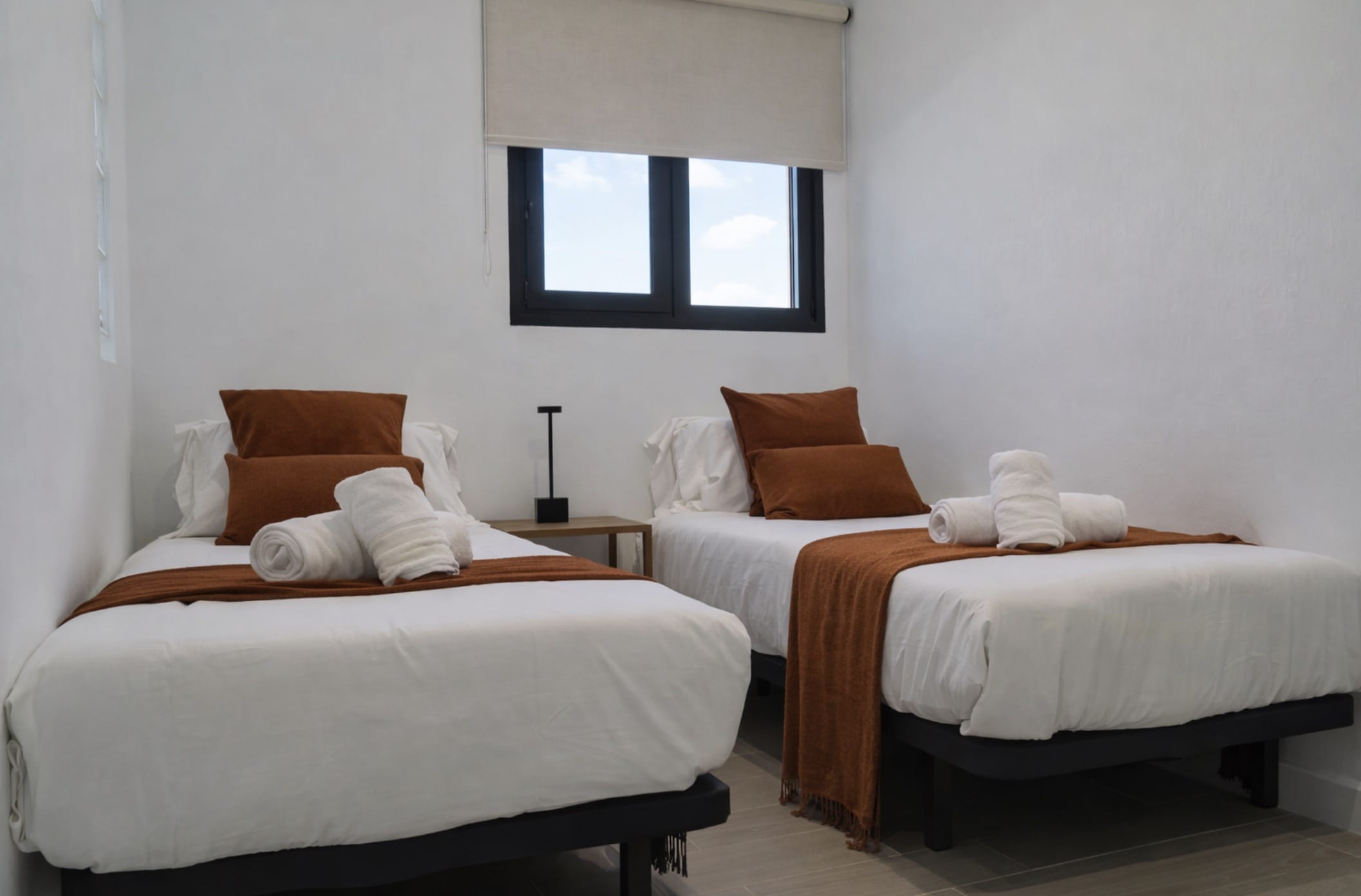 Amplia y luminosa suite principal con baño en suite, diseñada para ofrecer privacidad y confort durante tu estancia en Playa Blanca.