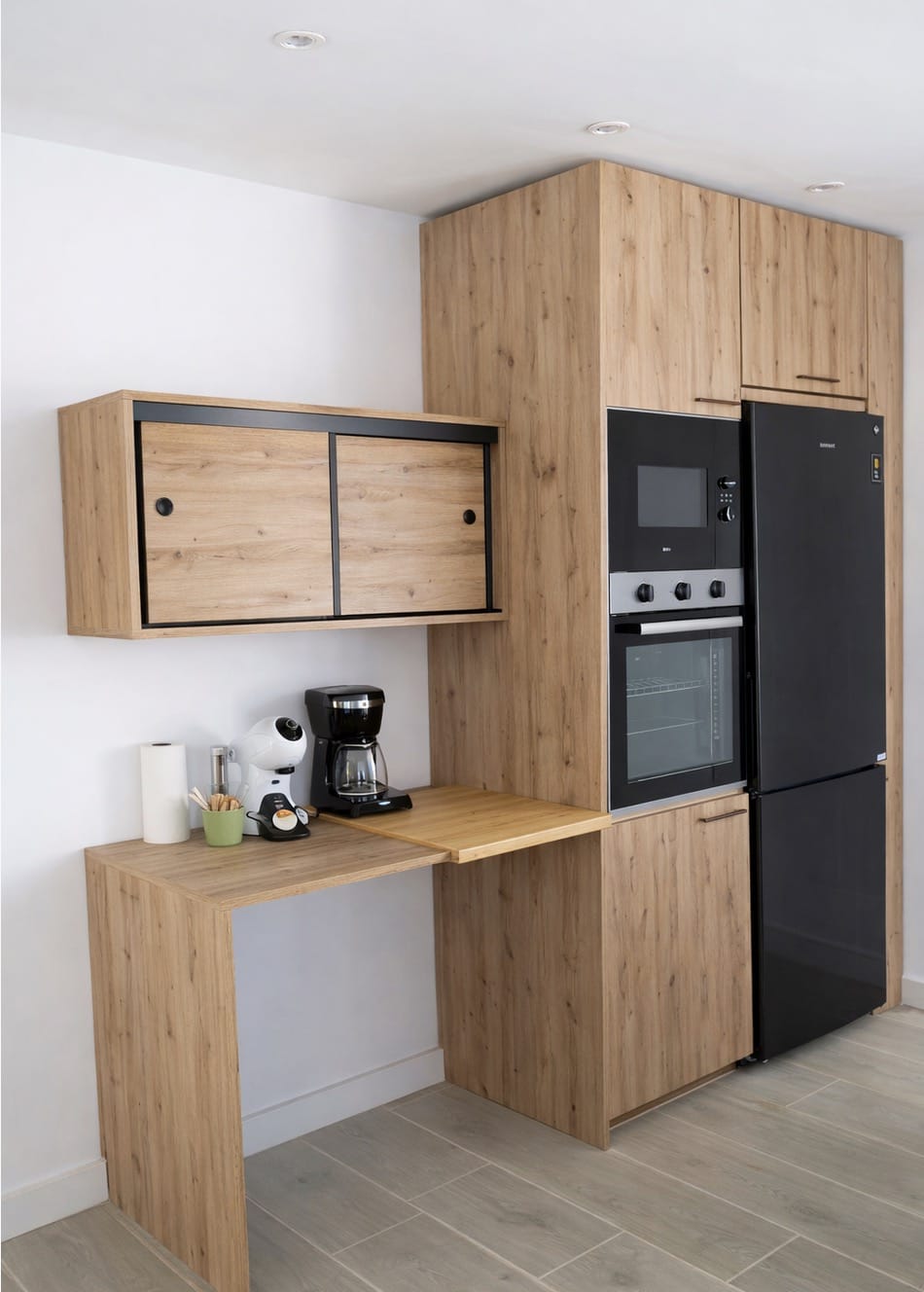 Cocina moderna y totalmente equipada, con amplia encimera y electrodomésticos para estancias cortas o largas.